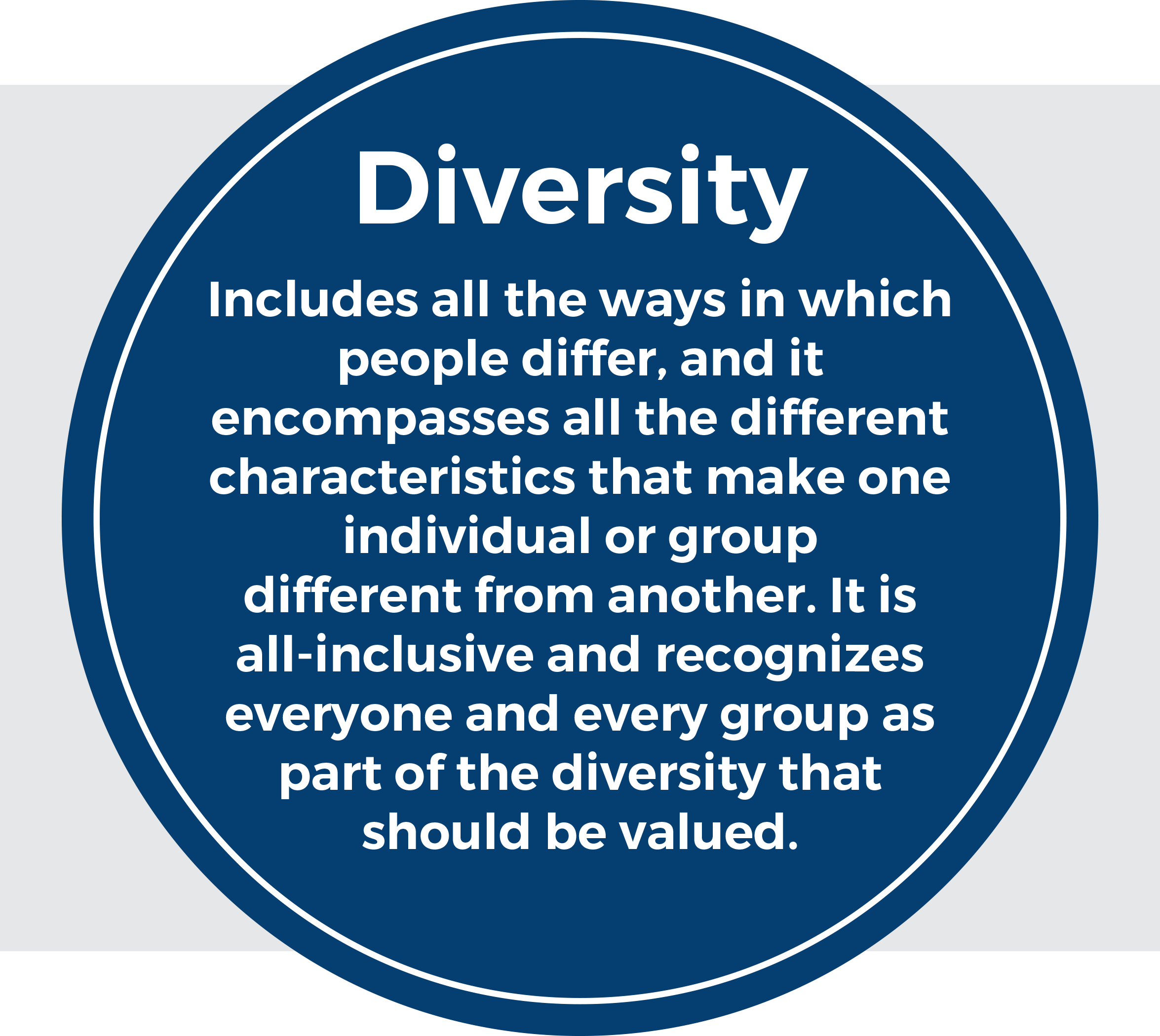 Diversity includes all the ways in which people differ, and it encompasses all the different characteristics that make one individual or group different from another. It is all-inclusive and recognizes everyone and every group as part of the diversity that should be valued. A broad definition includes not only race, ethnicity, and gender — the groups that most often come to mind when the term "diversity" is used — but also age, national origin, religion, disability, sexual orientation, socioeconomic status, education, marital status, language, and physical appearance. It also involves different ideas, perspectives, and values.